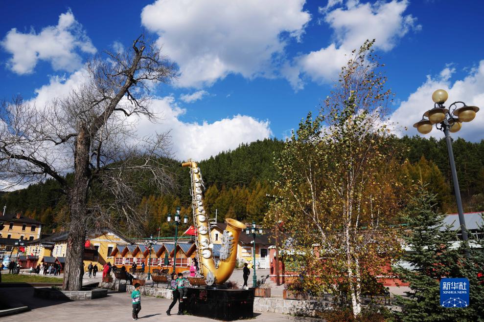 10月2日,游客在橫道河子鎮的文化藝術主題街區游覽拍照。