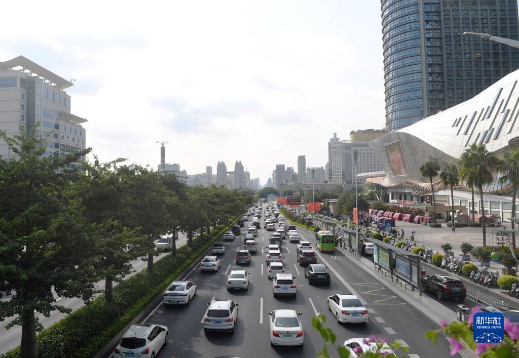 10月6日,進城車輛行駛在廣西南寧市民族大道上。