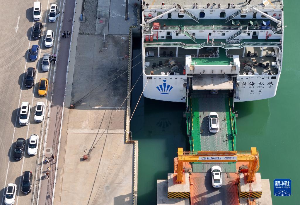 10月6日,在山東港口煙&港,跨越渤海海峽的車輛駛入煙&至大連的客滾船(無人機照片)。