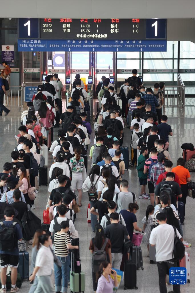 10月6日,旅客在福建廈門火車站候車大廳排隊等候驗票上車。