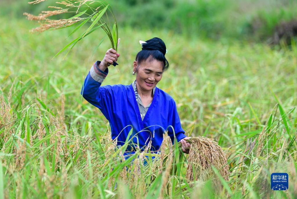 10月6日,農民在貴州省黎平縣雙江鎮黃崗村收割稻穀。