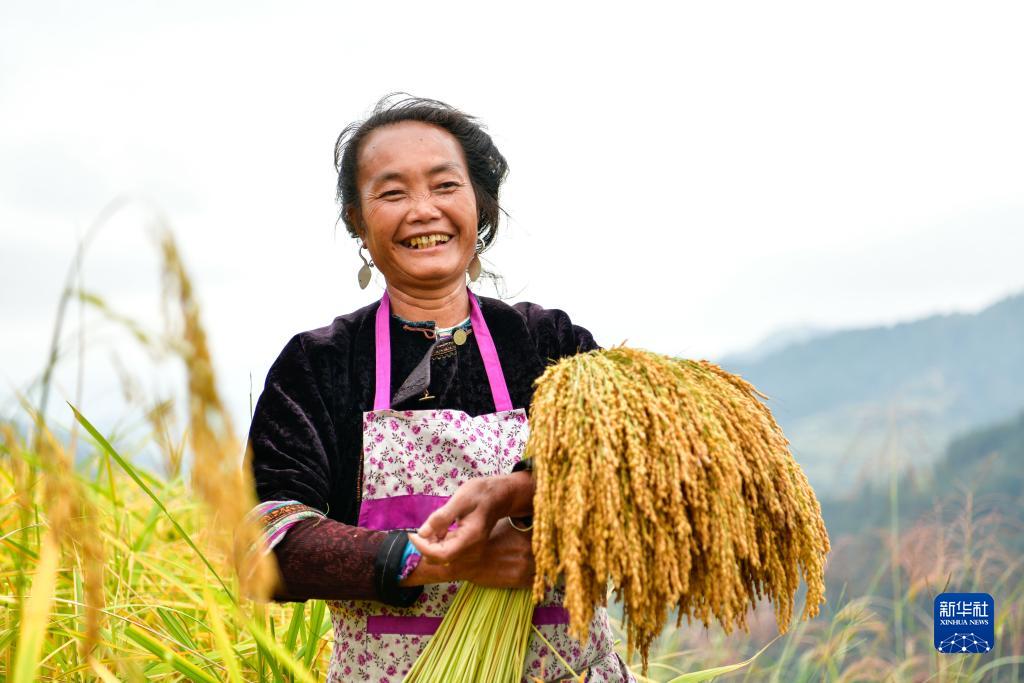 10月6日,農民在貴州省黎平縣雙江鎮黃崗村展示收割的稻穀。