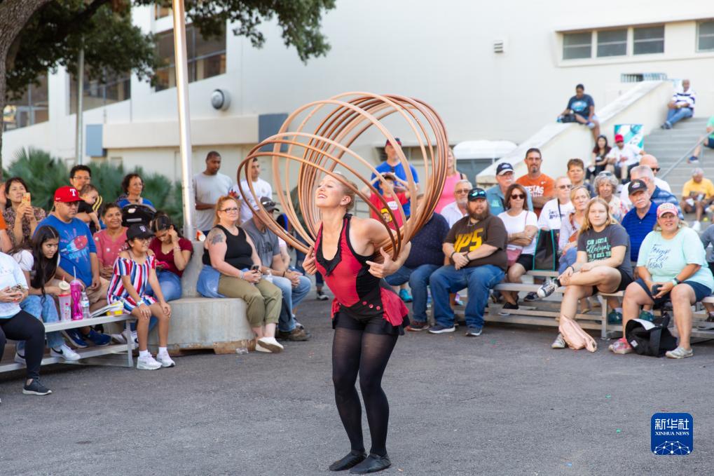 10月5日,一名演員在美國達拉斯的得克薩斯州博覽會上表演雜技。