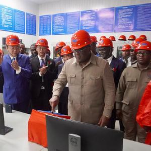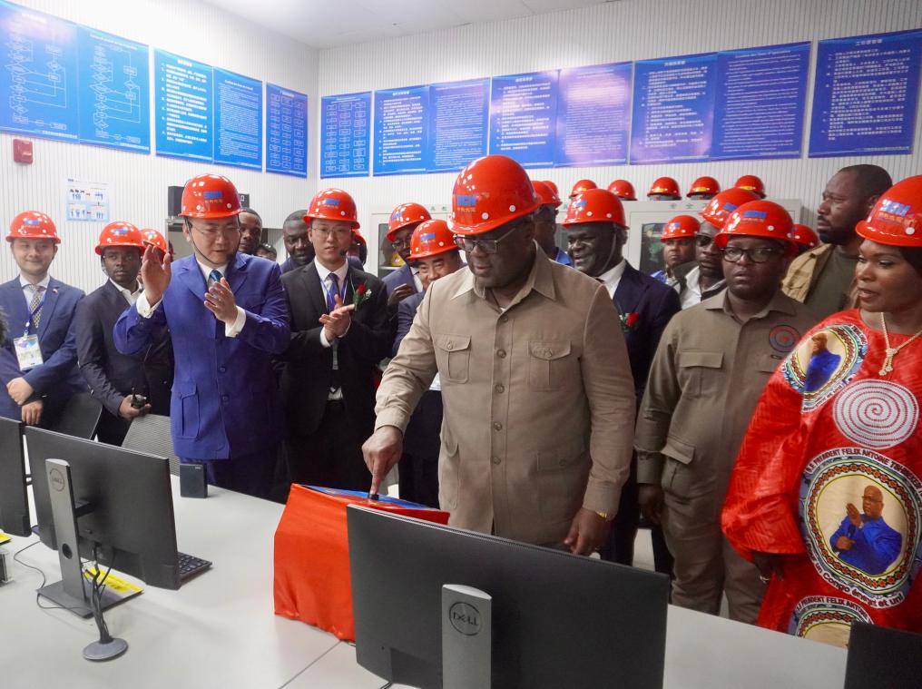 10月6日,剛果(金)總統齊塞克迪(中)在位於盧阿拉巴省的布桑加水電站按下發電機組運行總按鈕,這標誌着布桑加水電站正式開始發電。