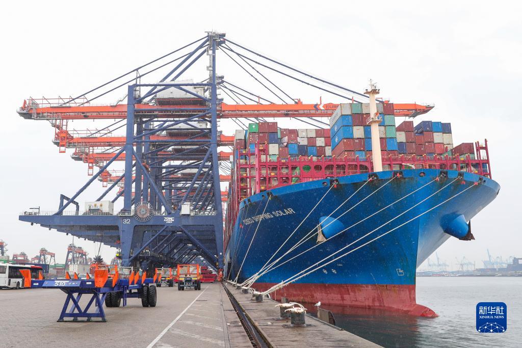 一艘中遠海運集團貨輪停靠在荷蘭鹿特丹港(5月1日攝)。據了解,迪爾克家安裝的中國産太陽能設備經海路到達荷蘭鹿特丹港後轉運至德國。