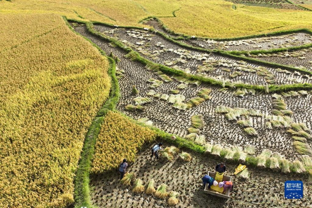 10月7日,農民在雲南騰衝市騰越街道上動連社區收穫稻穀(無人機照片)。