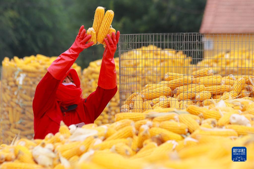 10月7日,在山東省高密市鹹家社區賈唐村,農民將收穫的玉米封囤歸倉。