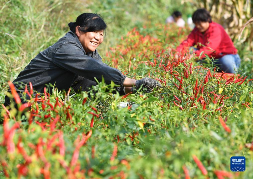 10月7日,河北省石家莊市井陘縣南峪鎮地都村農民在山間梯田採摘辣椒。