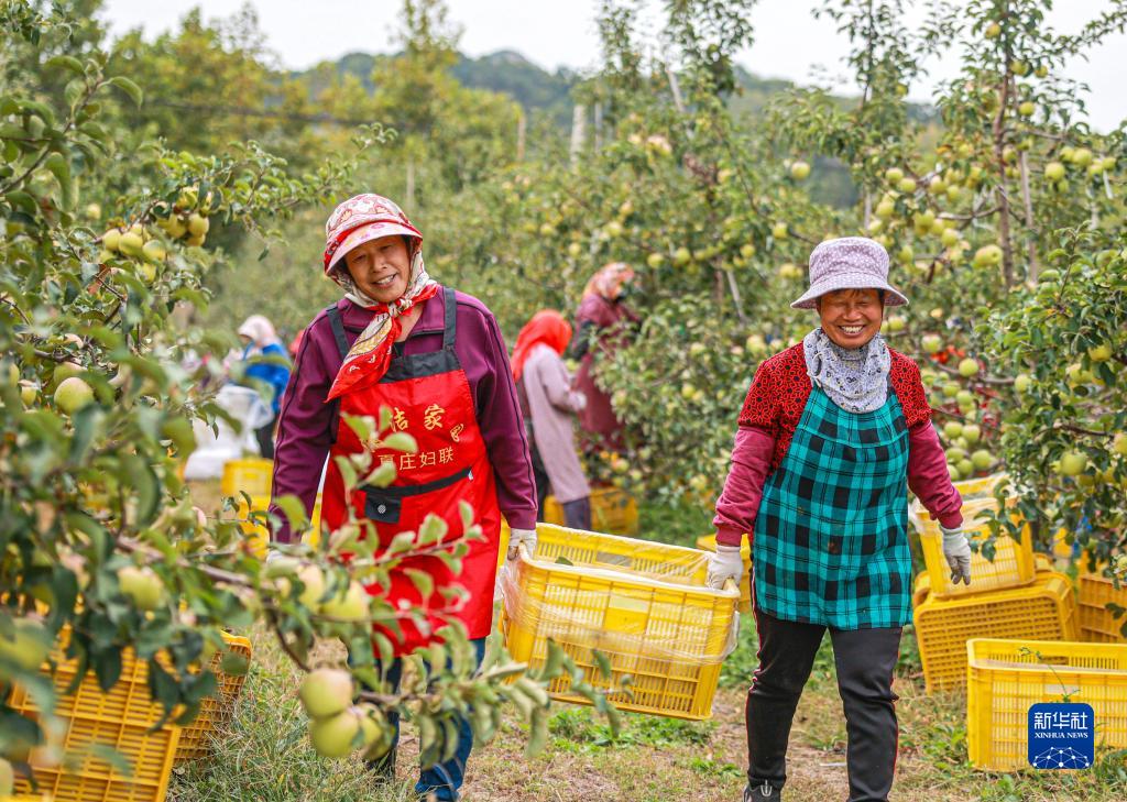 10月7日,在山東省榮成市俚島鎮花園谷一處蘋果園內,果農在採摘、分揀、裝運蘋果。