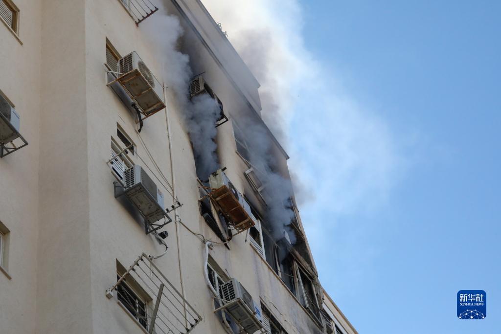 這是10月7日在以色列特拉維夫拍攝的一棟遭火箭彈襲擊的建築。