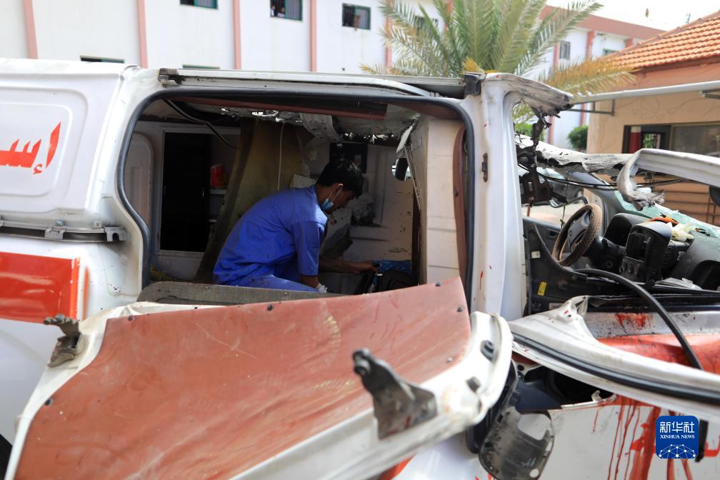 這是10月7日在加沙地帶城市汗尤尼斯拍攝的在以色列空襲中受損的救護車。