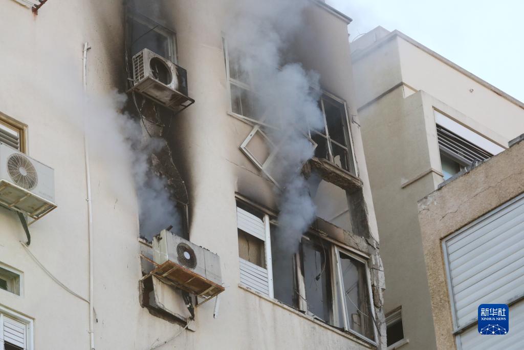 這是10月7日在以色列特拉維夫拍攝的一棟遭火箭彈襲擊的建築。