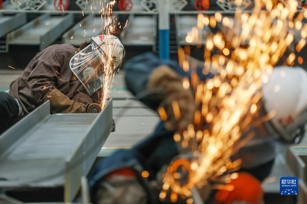 10月7日,工人在海油工程天津智能化製造基地結構預製車間內進行切割作業。