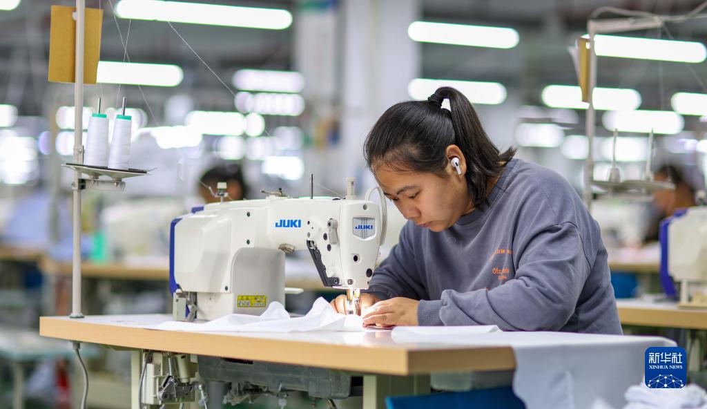 10月7日,貴州省銅仁市玉屏侗族自治縣一家服裝生産企業的工人在生産服裝。