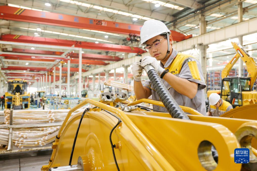 10月7日,在山東省青島西海岸新區黃島街道雷沃重工生産車間,工人在大型挖掘機生産線作業。
