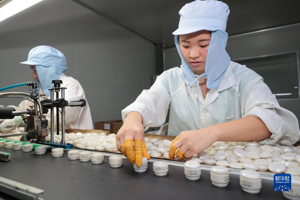 10月7日,工人在浙江省湖州市吳興區埭溪鎮一家化粧品企業工作。