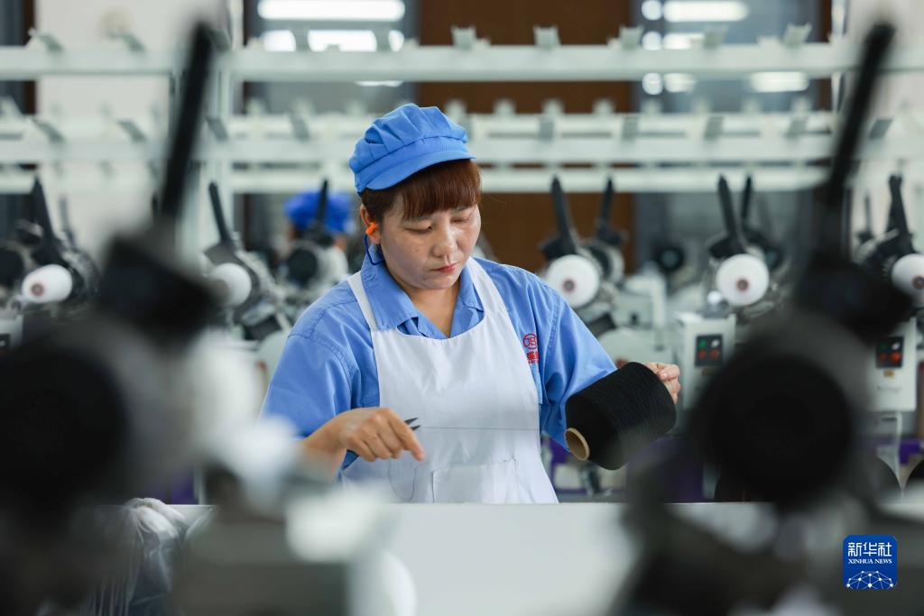 10月7日,工人在貴州省黔東南苗族侗族自治州三穗縣一家運動服飾企業紡織車間工作。