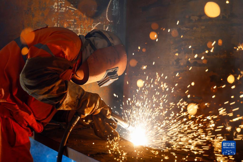 10月7日,工人在海油工程天津智能化製造基地結構預製車間進行焊接作業。