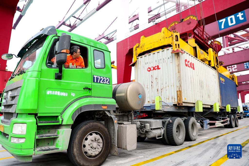 10月7日,集裝箱貨車在山東港口青島港運載貨物。