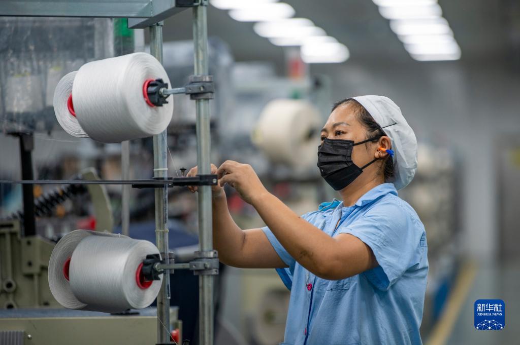 10月7日,工人在位於浙江省蘭溪市的浙江金梭紡織有限公司牛仔面料自動化生産線旁巡檢。