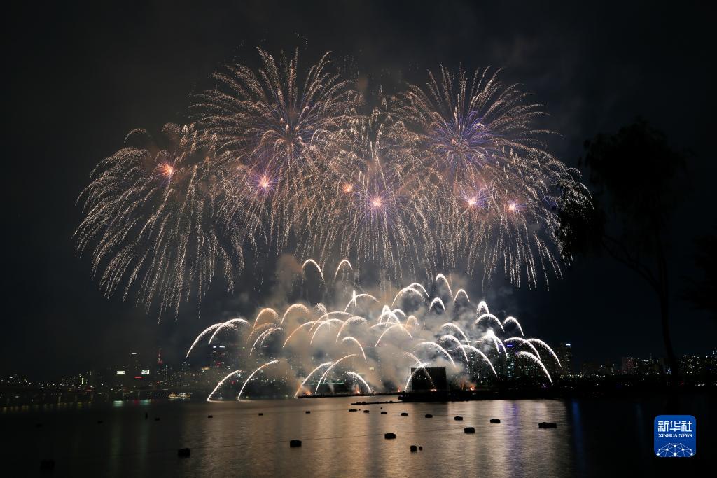 當日,首爾國際煙花節在韓國首爾汝矣島漢江公園一帶舉行,絢麗煙花點亮了首爾夜空。新華社記者 王益亮 攝