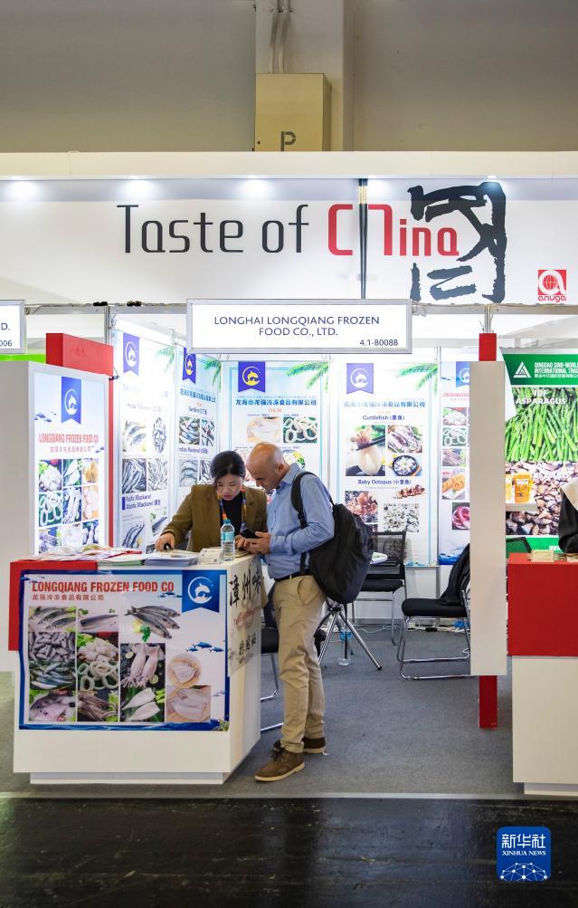 10月7日,參觀者在德國科隆國際食品博覽會的一個中國企業展&參觀交談。新華社記者 張帆 攝