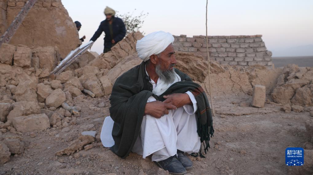 10月7日,在阿富汗赫拉特省,一名老人坐在自家坍塌的房屋前。
