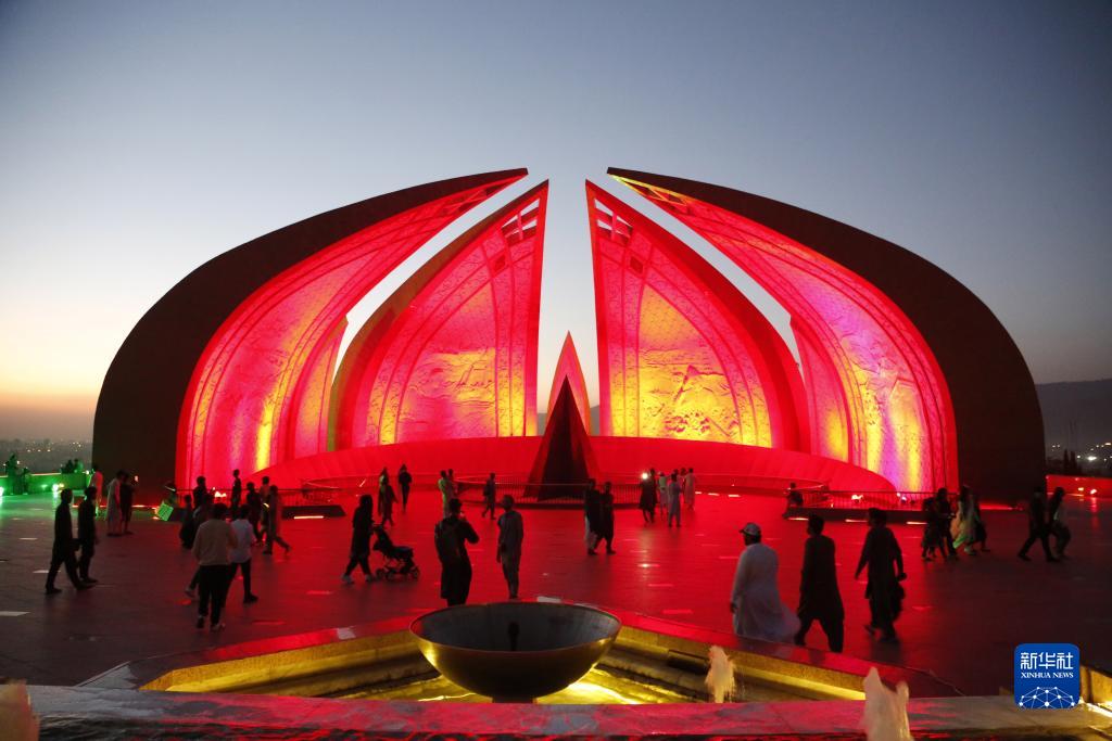 10月1日,巴基斯坦首都伊斯蘭堡地標建築點亮“中國紅”,慶祝中華人民共和國成立74周年。