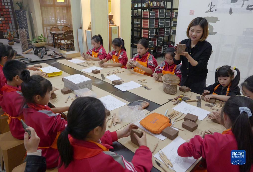 10月7日,在河南省洛陽市新安縣河洛澄泥硯藝術館,游曉曉在教小學生製作澄泥硯。
