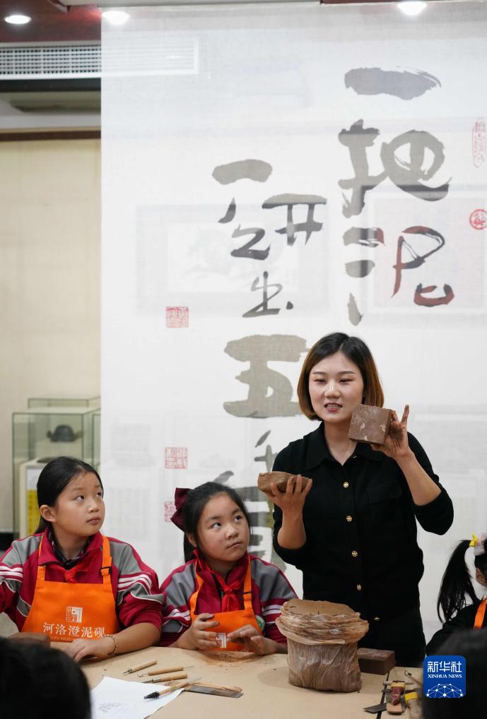 10月7日,在河南省洛陽市新安縣河洛澄泥硯藝術館,游曉曉在教小學生製作澄泥硯。