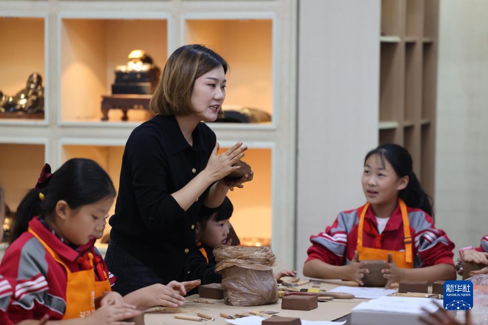 10月7日,在河南省洛陽市新安縣河洛澄泥硯藝術館,游曉曉在教小學生製作澄泥硯。