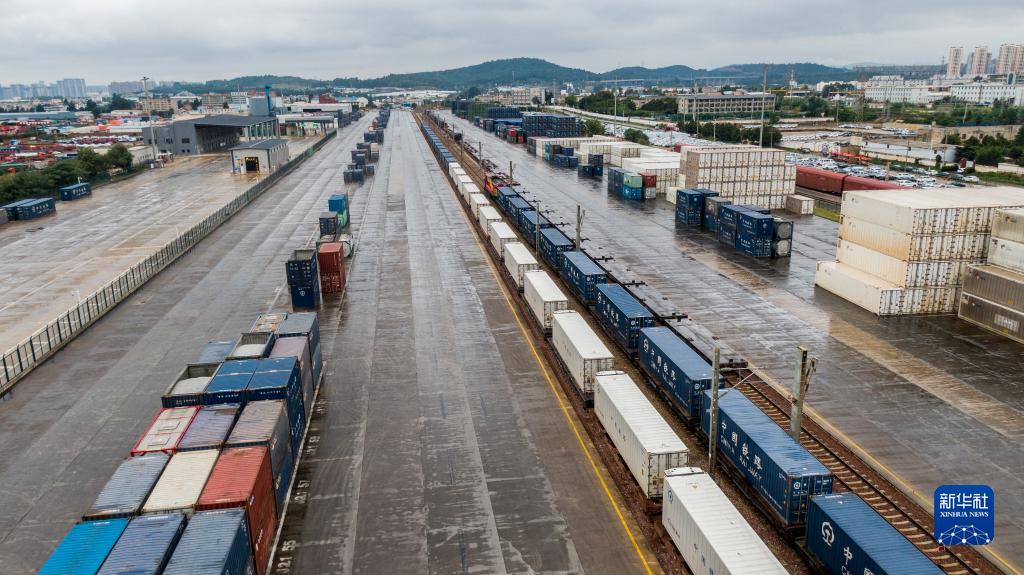 10月8日,“滬滇·瀾湄線”國際貨運班列駛出昆明市王家營西站(無人機照片)。