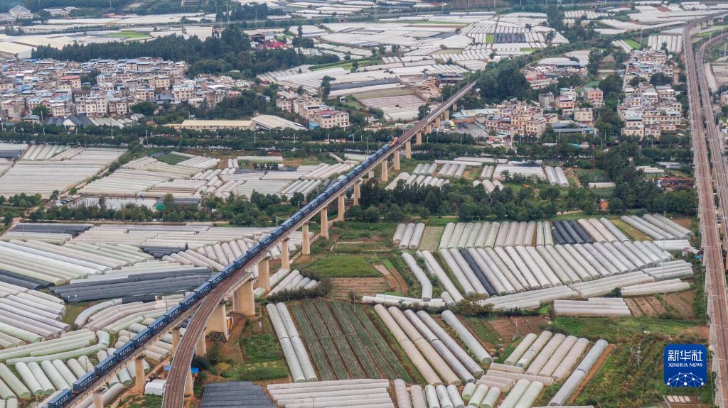 10月8日,“滬滇·瀾湄線”國際貨運班列駛出昆明市王家營西站(無人機照片)。