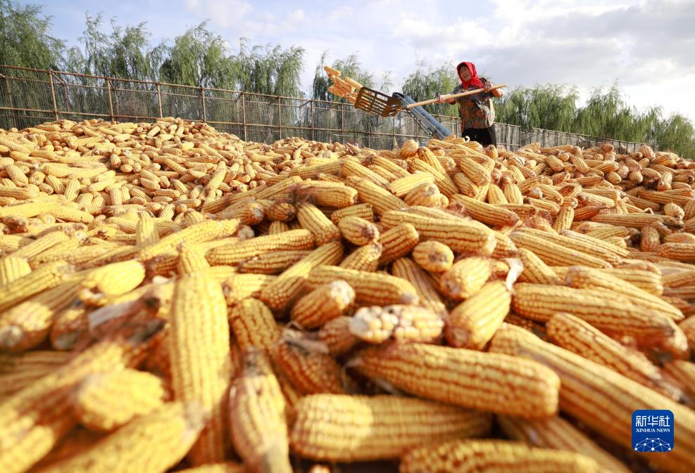 10月4日,河北唐山豐南區唐坊鎮孔家莊村一名農民在晾曬玉米。