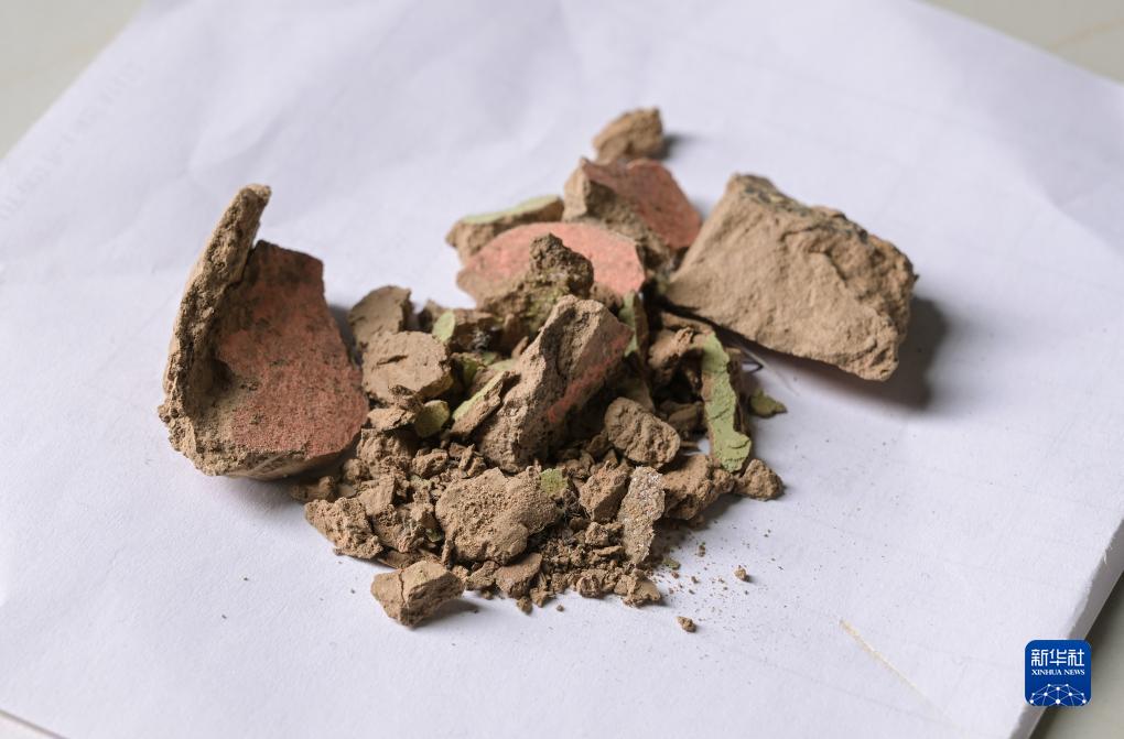 在秦始皇帝陵博物院文物保護部彩色陶俑修復室內的工作&上擺放着發掘出土的土塊,這些剝落的彩色土塊正等待修復人員採用精湛的技術復原(8月23日攝)。