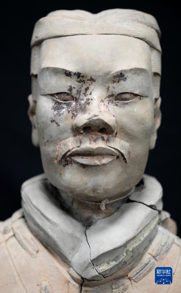 這是秦俑臉部和衣領上的彩繪還原修復後的樣貌(8月23日攝)。