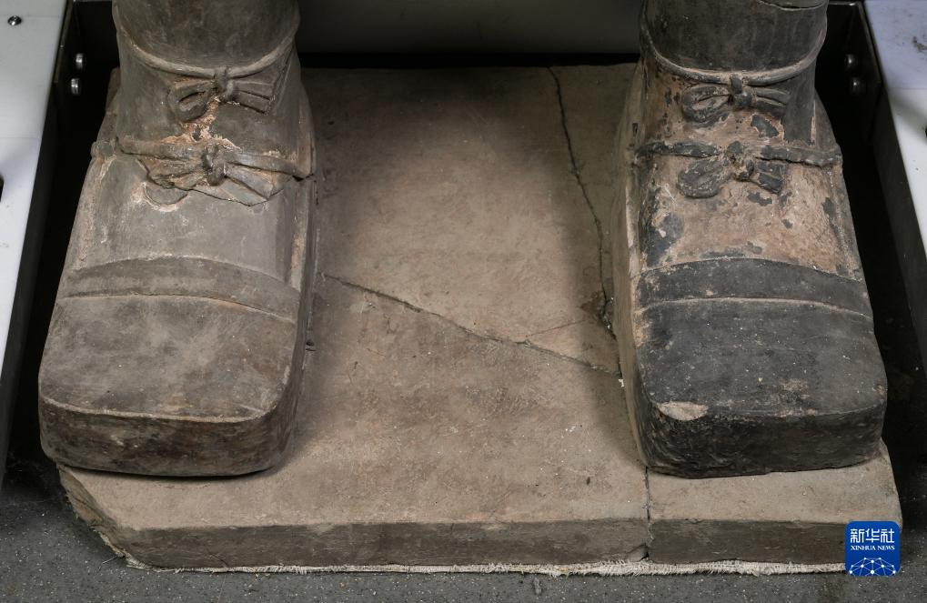在秦始皇帝陵博物院文物保護部彩色陶俑修復室內,一尊秦俑的雙腳被工匠塑造出細節(8月23日攝)。