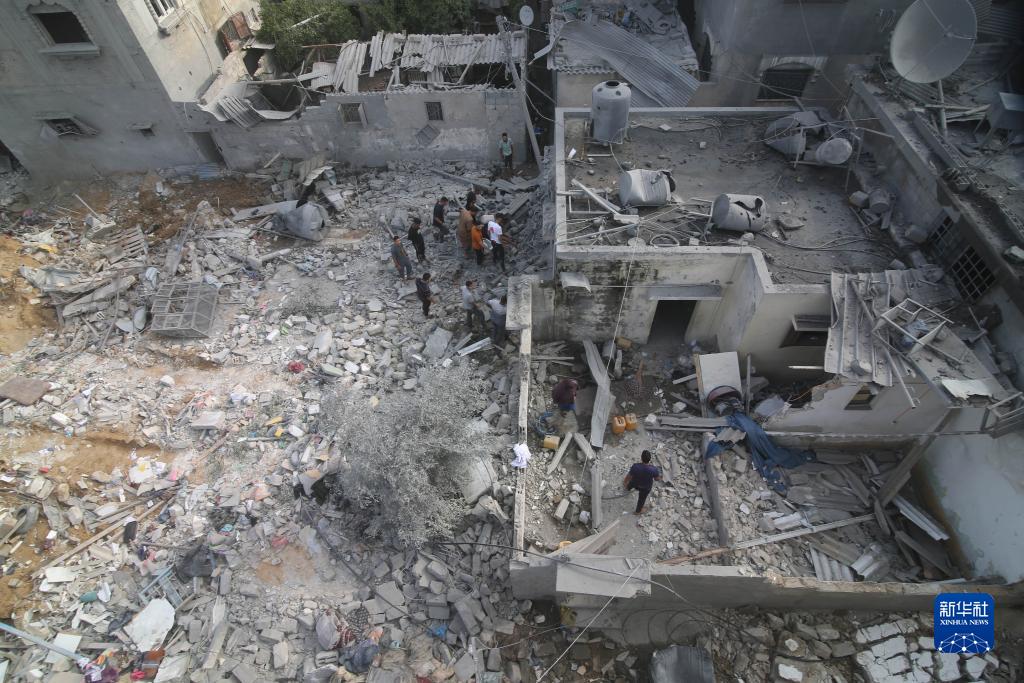 10月8日,在加沙地帶南部城市拉法,人們查看被以色列空襲炸毀的建築。