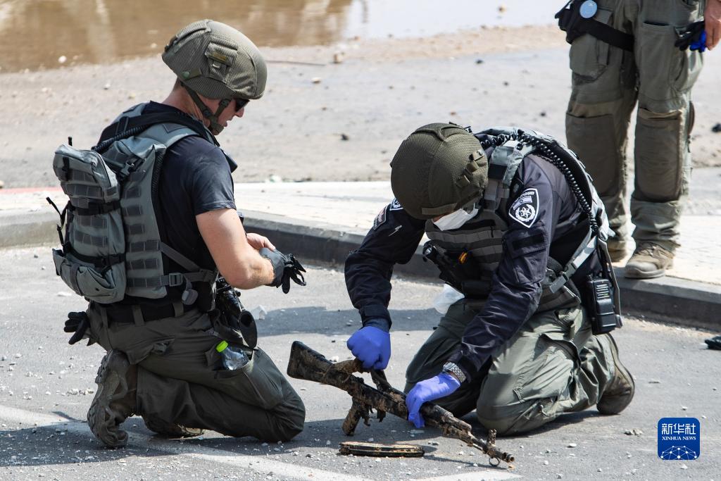 10月8日,在以色列南部城市斯代羅特,以色列警察檢查從哈馬斯武裝人員手中繳獲的武器。