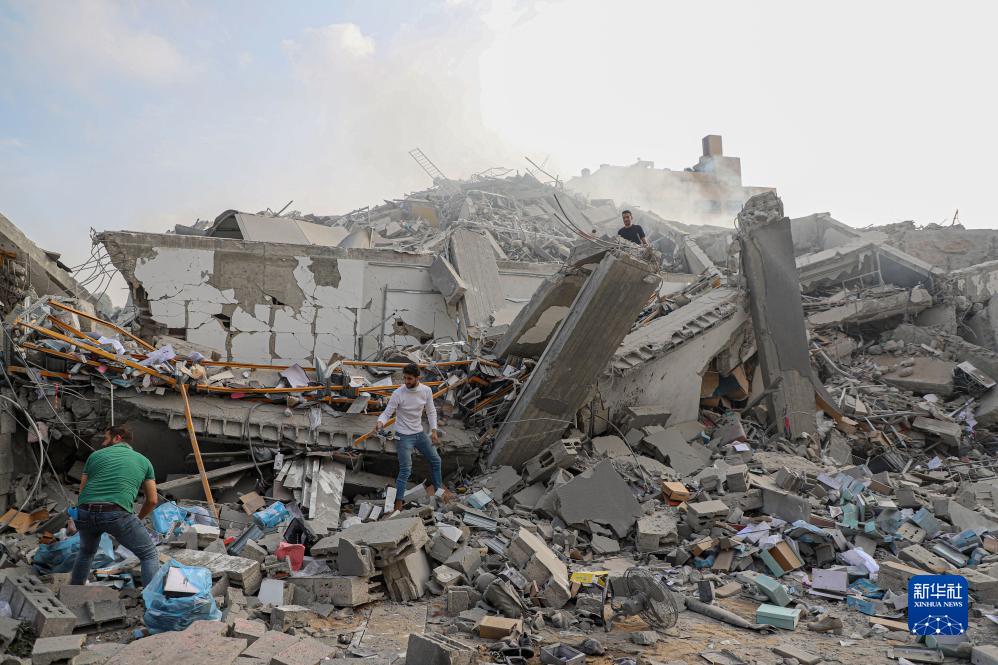 10月8日,在加沙城,巴勒斯坦人查看以色列空襲後的建築廢墟。