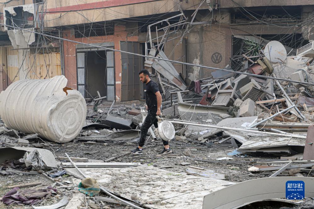 10月8日,在加沙城,一名巴勒斯坦人從以色列空襲後的建築廢墟中尋找物品。