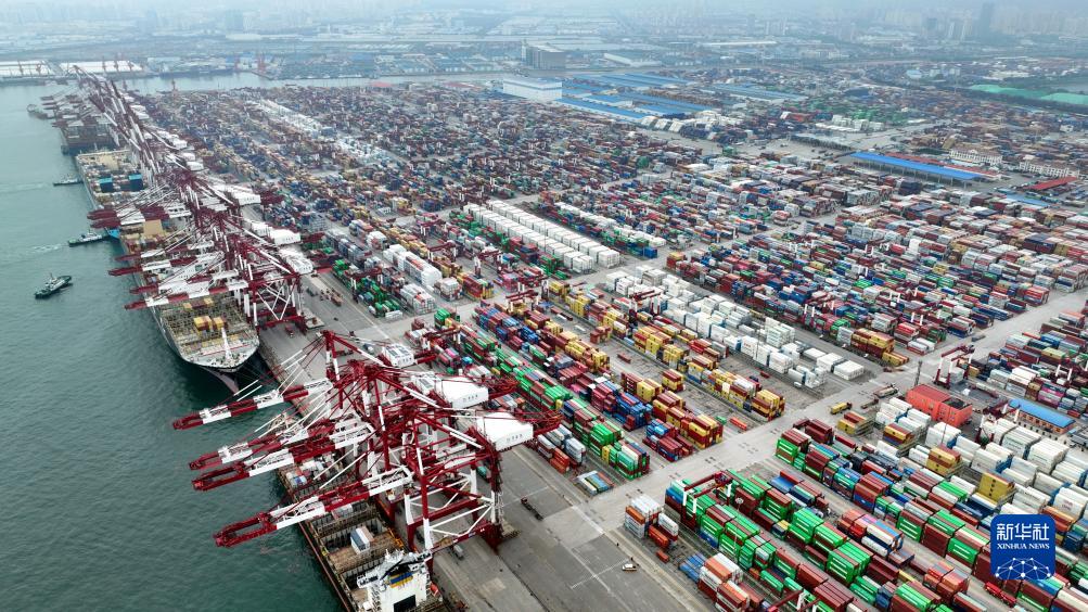 這是2022年7月29日拍攝的繁忙的山東港口青島港前灣集裝箱碼頭(無人機照片)。
