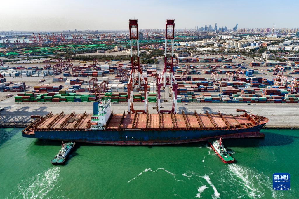 一艘貨輪停靠天津港(2020年10月27日攝,無人機照片)。