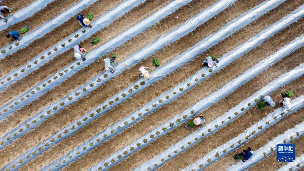 10月8日,村民在貴州省黔南布依族苗族自治州羅甸縣逢亭鎮腮裏村的田間移栽蔬菜苗(無人機照片)。