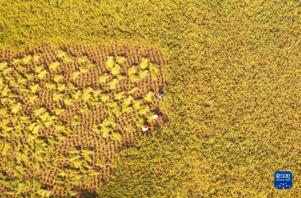 10月8日,農民在貴州省銅仁市松桃苗族自治縣盤信鎮柳浦村收割晚稻(無人機照片)。