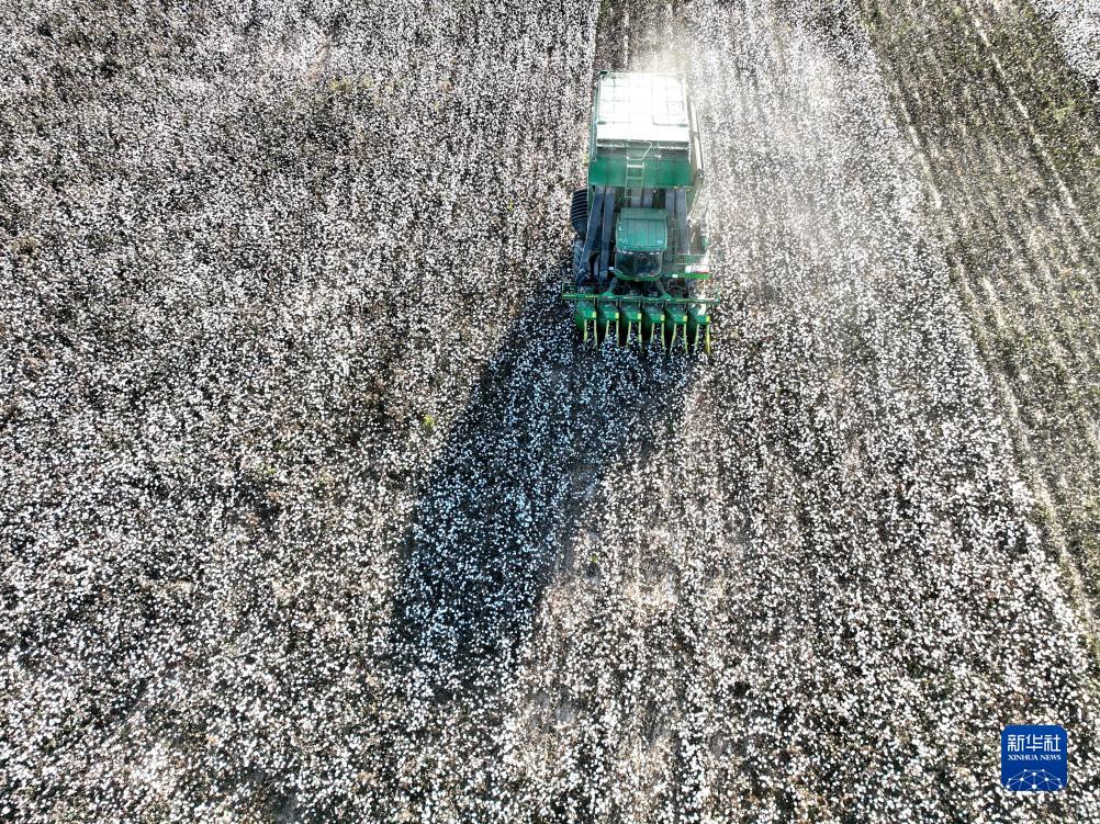 10月8日,在甘肅省敦煌市轉渠口鎮階州村,農民駕駛採棉機采收棉花(無人機照片)。