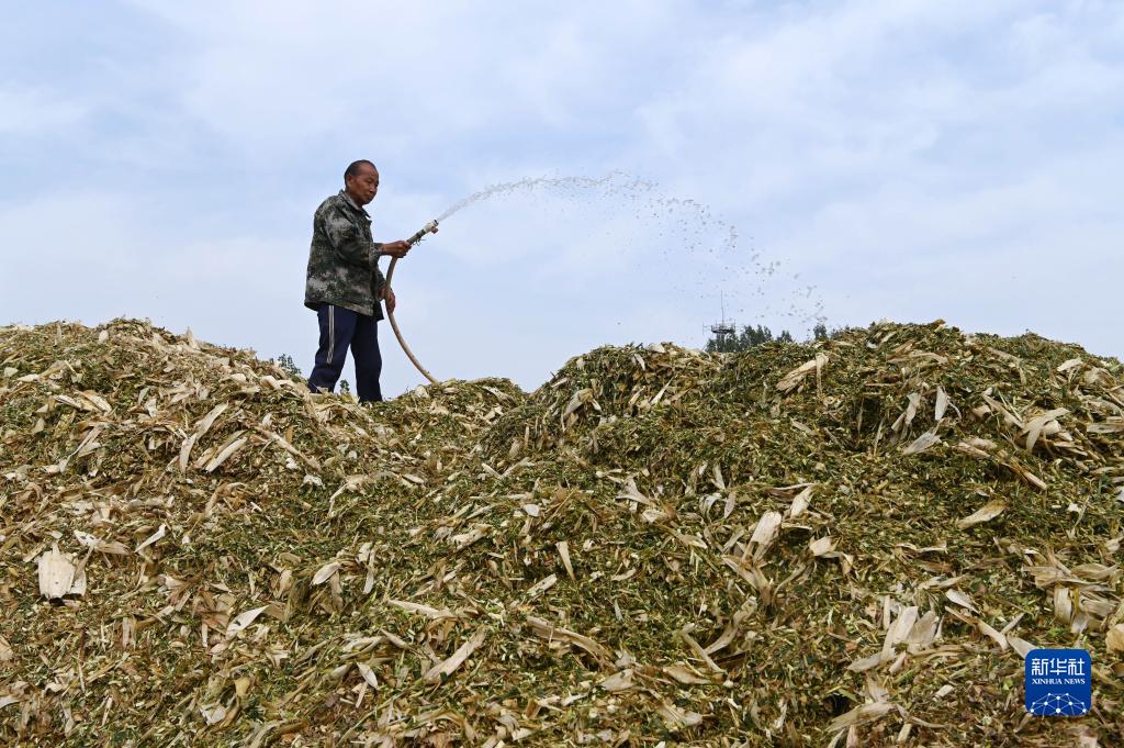 10月8日,在河南省沁陽市柏香鎮南王村,一家種植專業合作社社員為回收的玉米秸稈噴水。