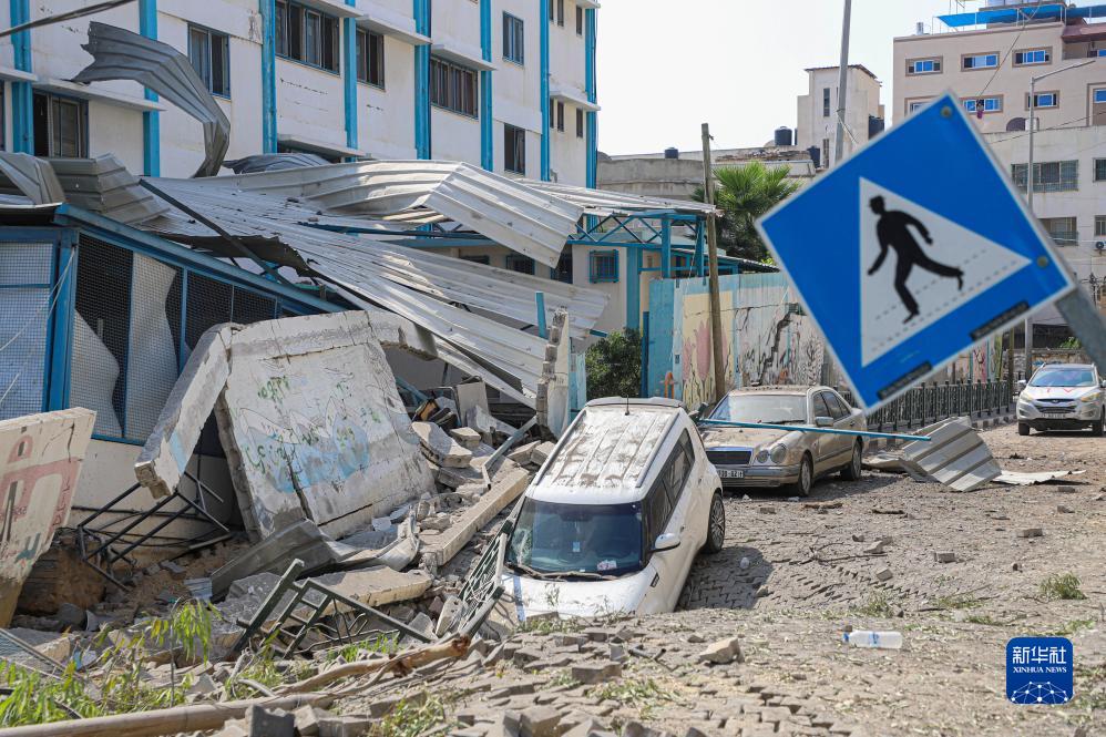 這是10月8日在加沙城拍攝的被以色列空襲炸毀的一所學校的入口。