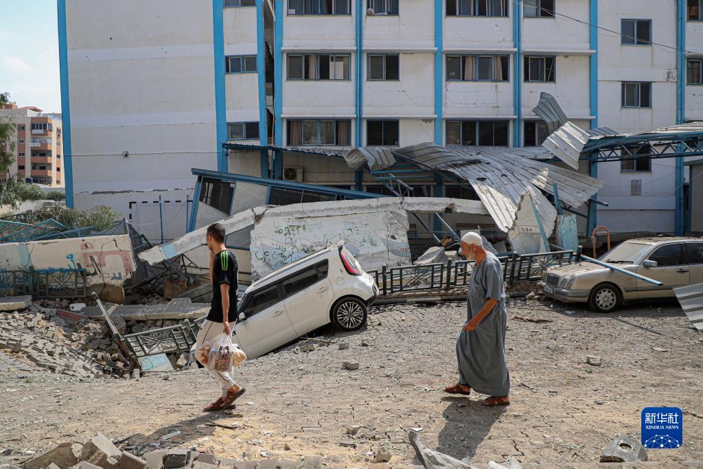 10月8日,在加沙城,人們走過被以色列空襲炸毀的一所學校的入口。