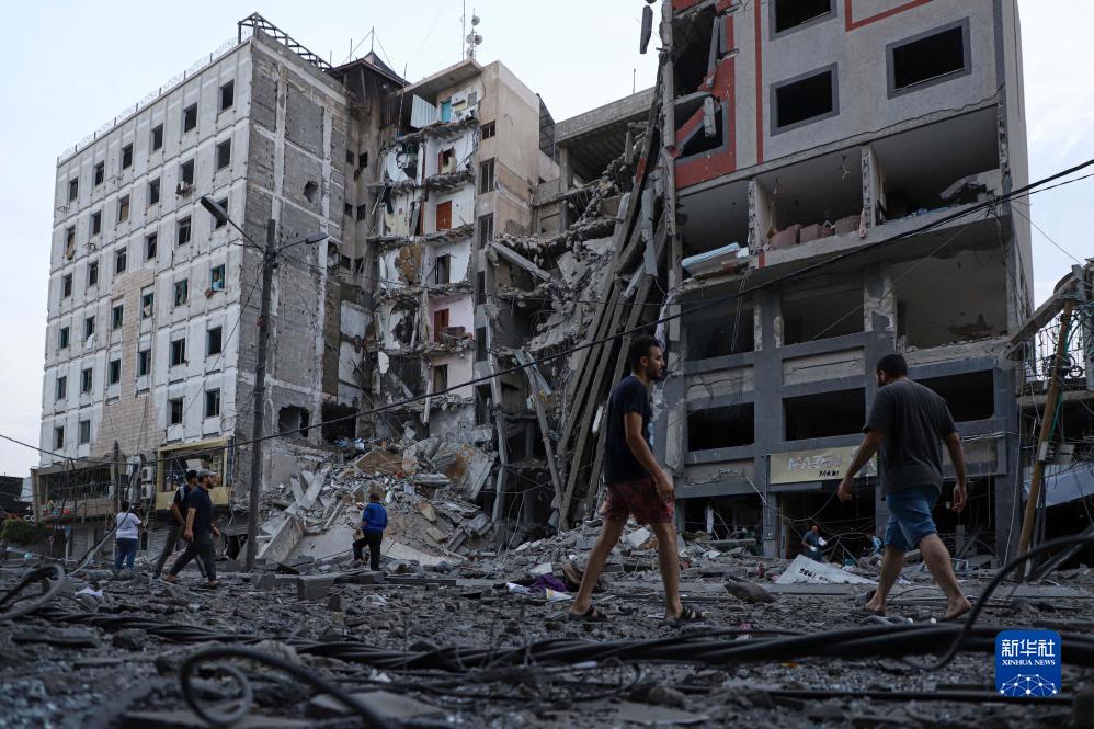 10月8日,巴勒斯坦人在加沙城查看以色列空襲後的建築廢墟。